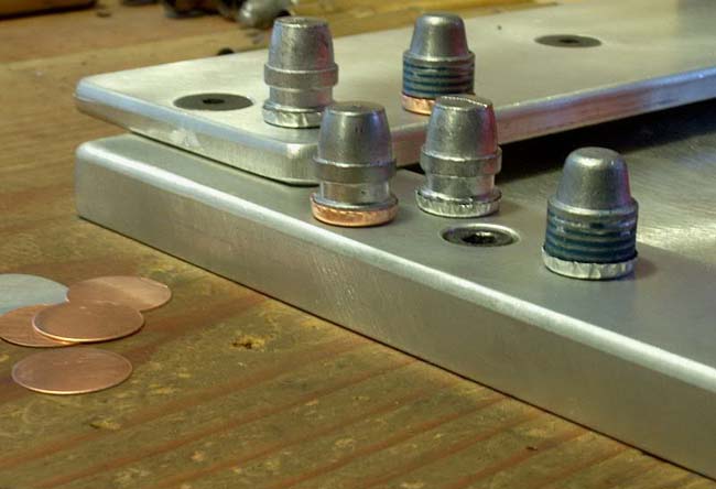 Hard lead is more difficult to work with using PB checks. What I’m showing here is about the limit and that is with .010″ copper and wheel weights. You will not be able to get away with using .010″, on hard old WW cast every time. The best PB gas check metal performance is with .004 and .008 thick soda can metal on freshly cast bullets.